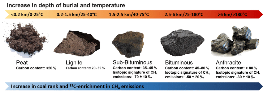 • ถ่านหิน (coal) เกิดขึ้นจากพืชที่กักเก็บคาร์บอนจากบรรยากาศและรวมเข้ากับองค์ประกอบอื่นๆ เพื่อสร้างเนื้อเยื่อของพืช